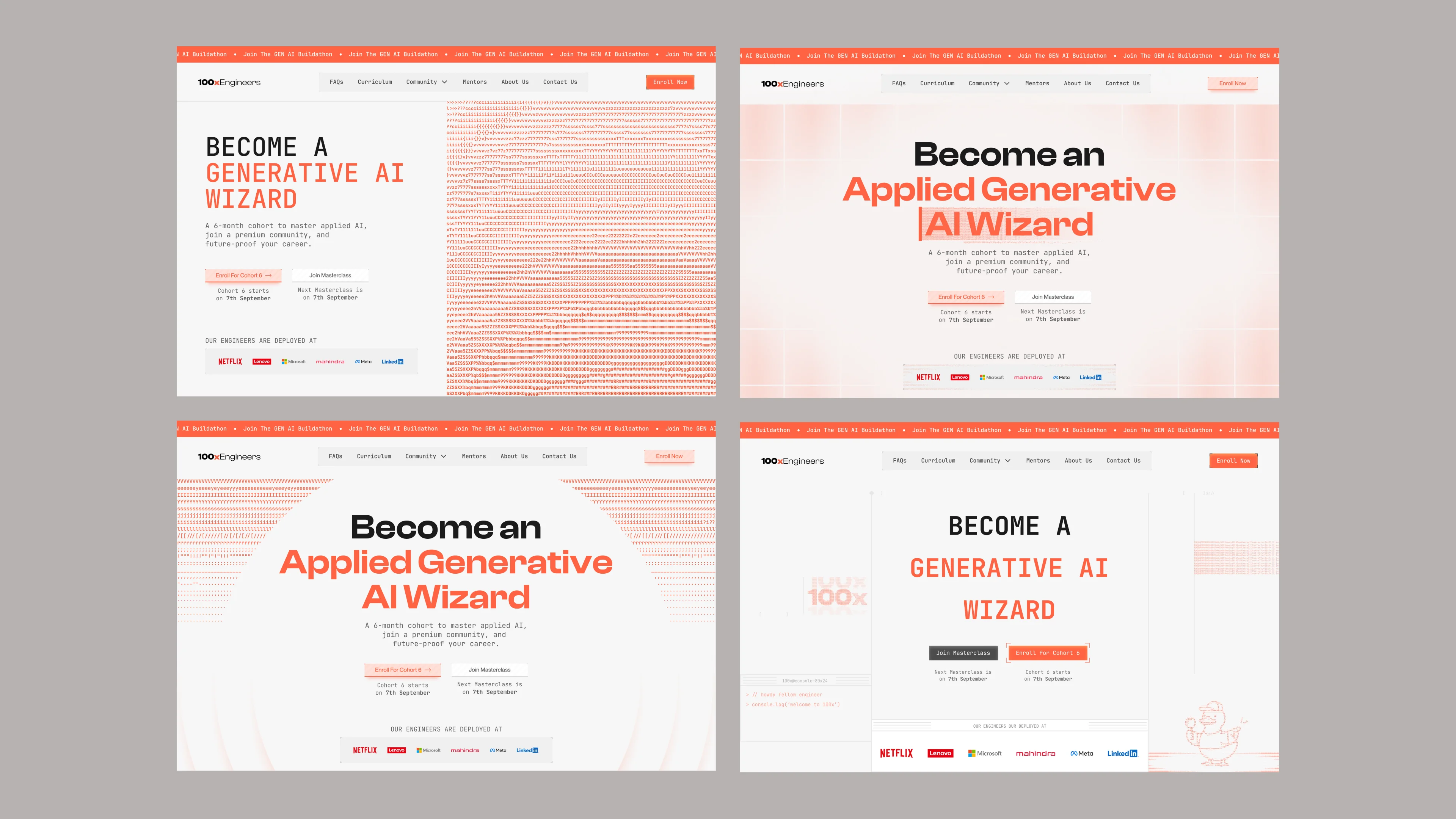 We audited 100x's brand alongside competitors across AI education. The existing dark-mode tech-heavy identity was blending into everything else on the market. We explored ASCII art, source code aesthetics and generative visuals as potential directions. Moodboards spanned web, graphics and merch to validate that an ASCII-driven system could scale across all three.