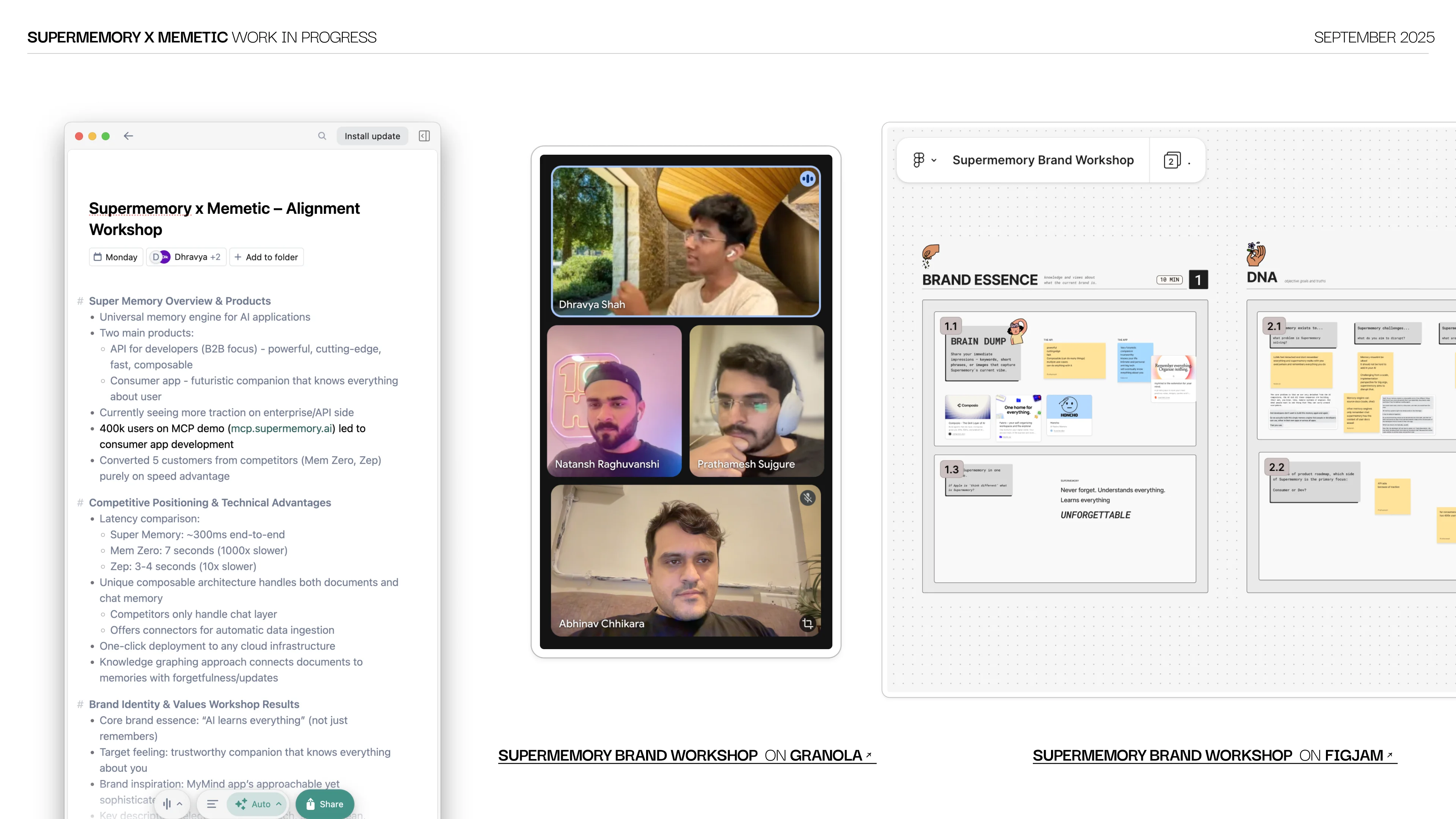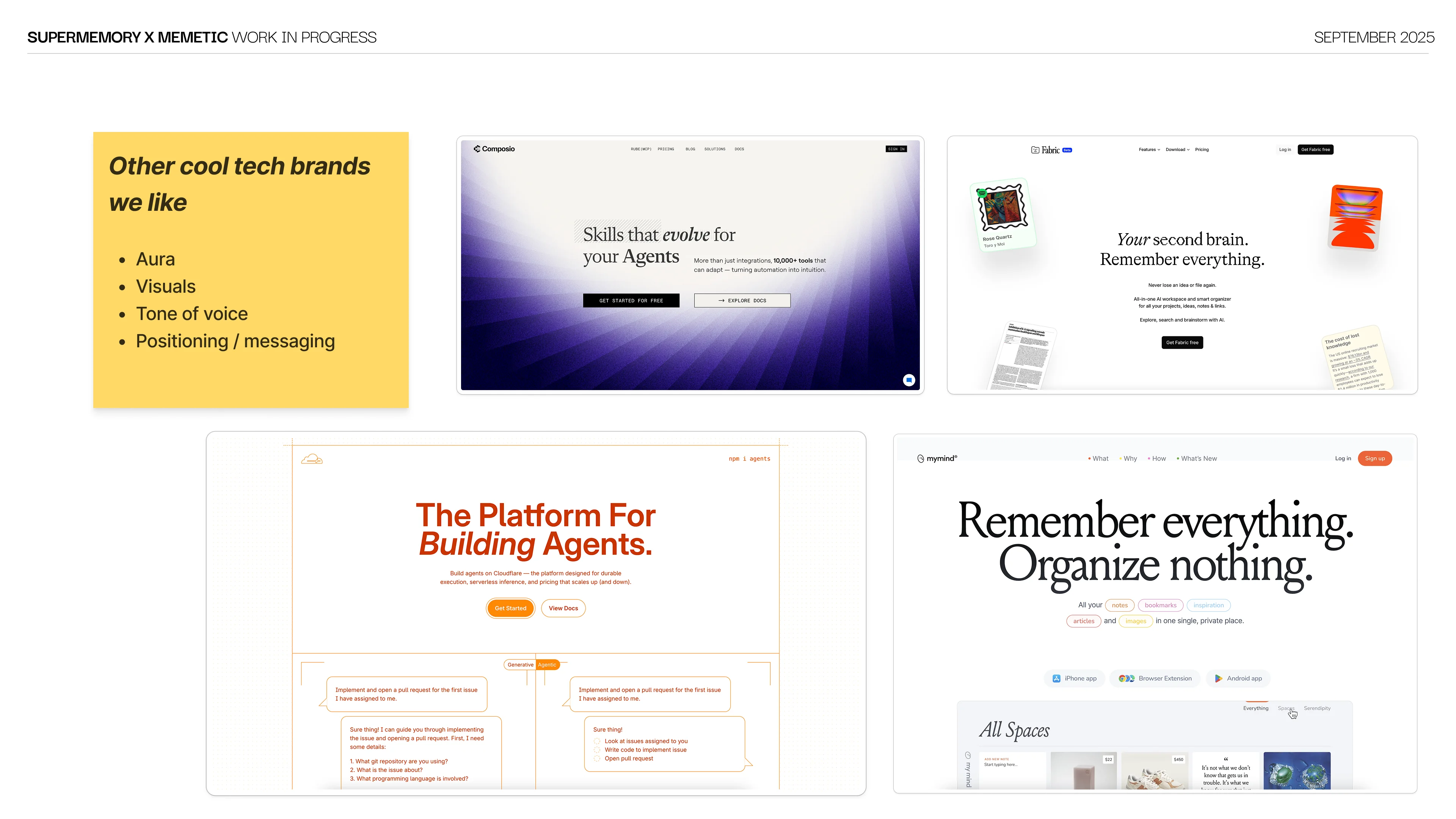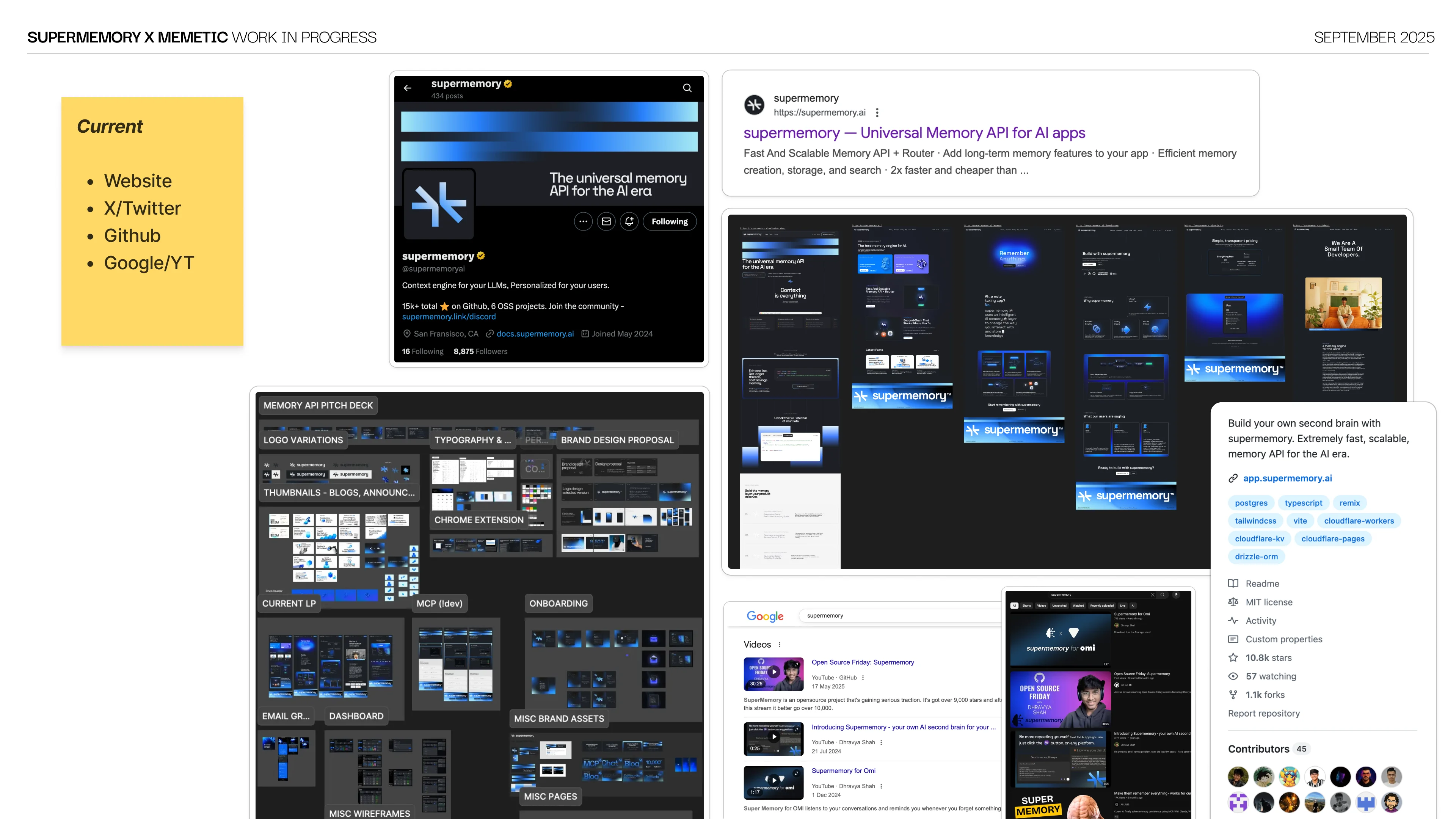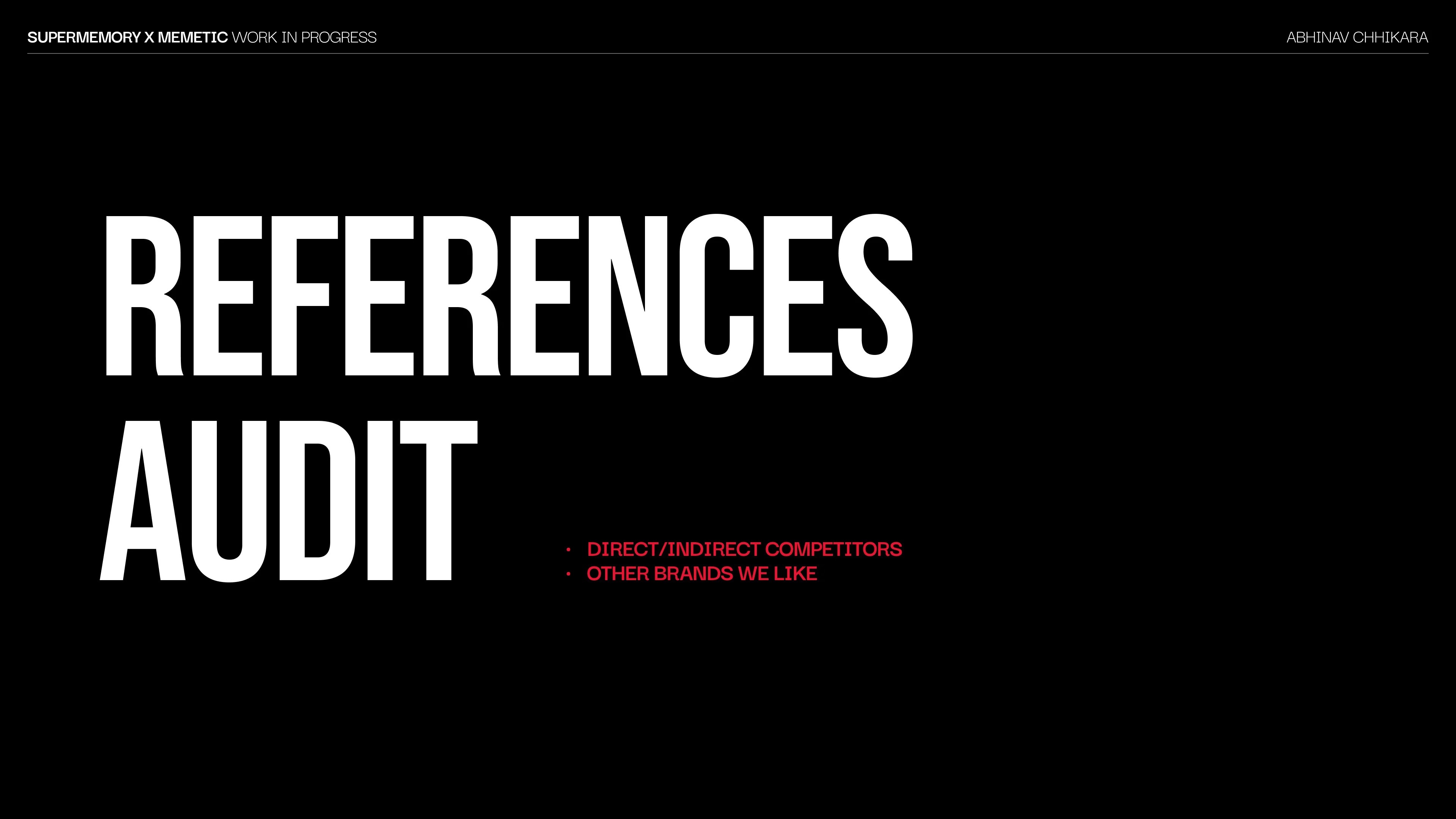 We ran a custom brand workshop with Dhravya, CEO and founder of Supermemory. Product deep-dive, competitor mapping and audience definition, all pre-researched from our side. The workshop gave us a window into the founder's thinking and the reasoning behind product decisions. We synthesized the session with AI and call transcripts into brand direction ideas that shaped every design decision moving forward.