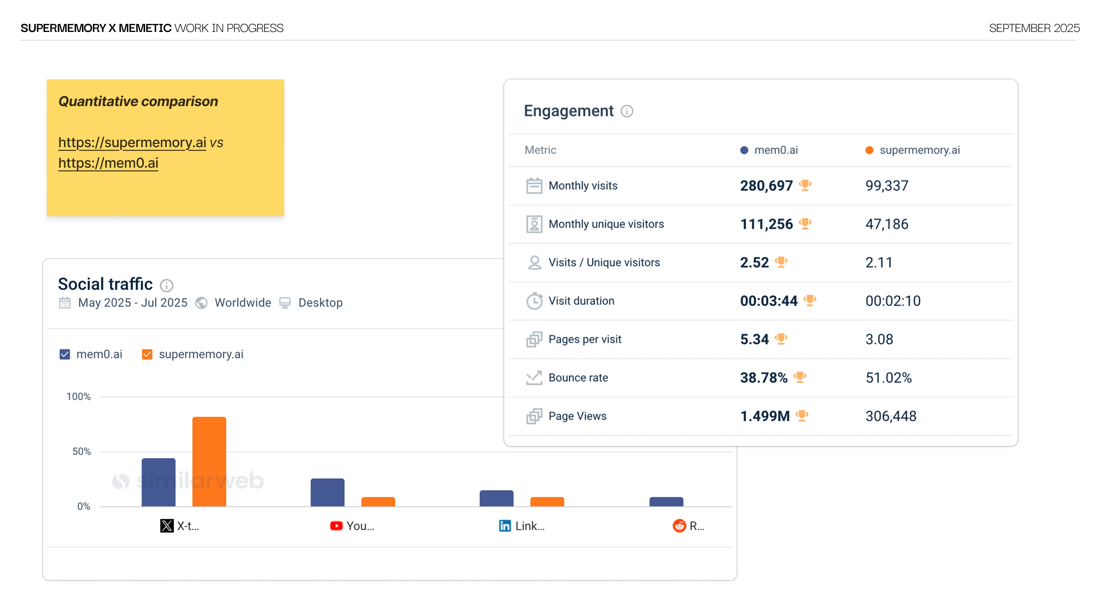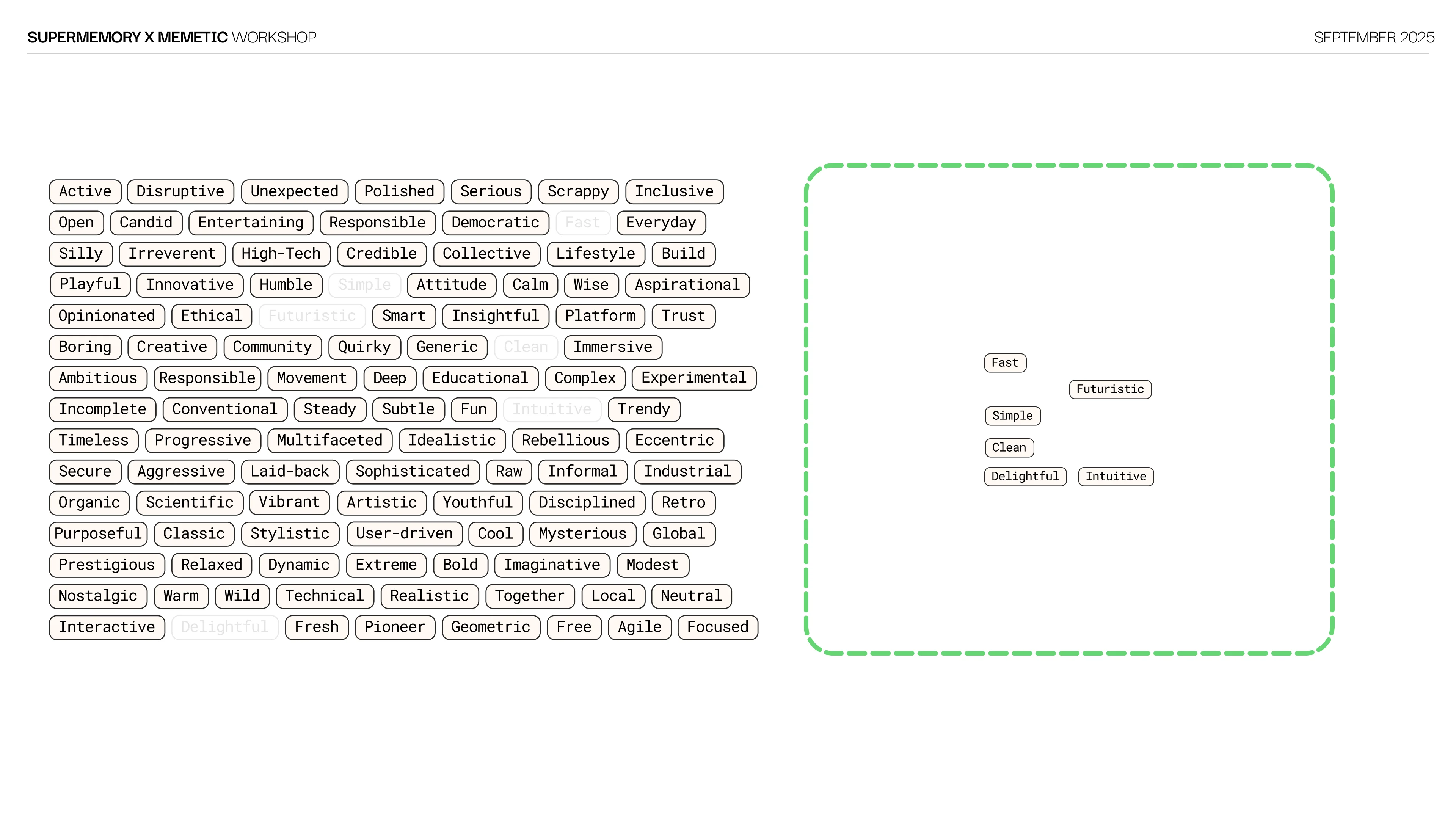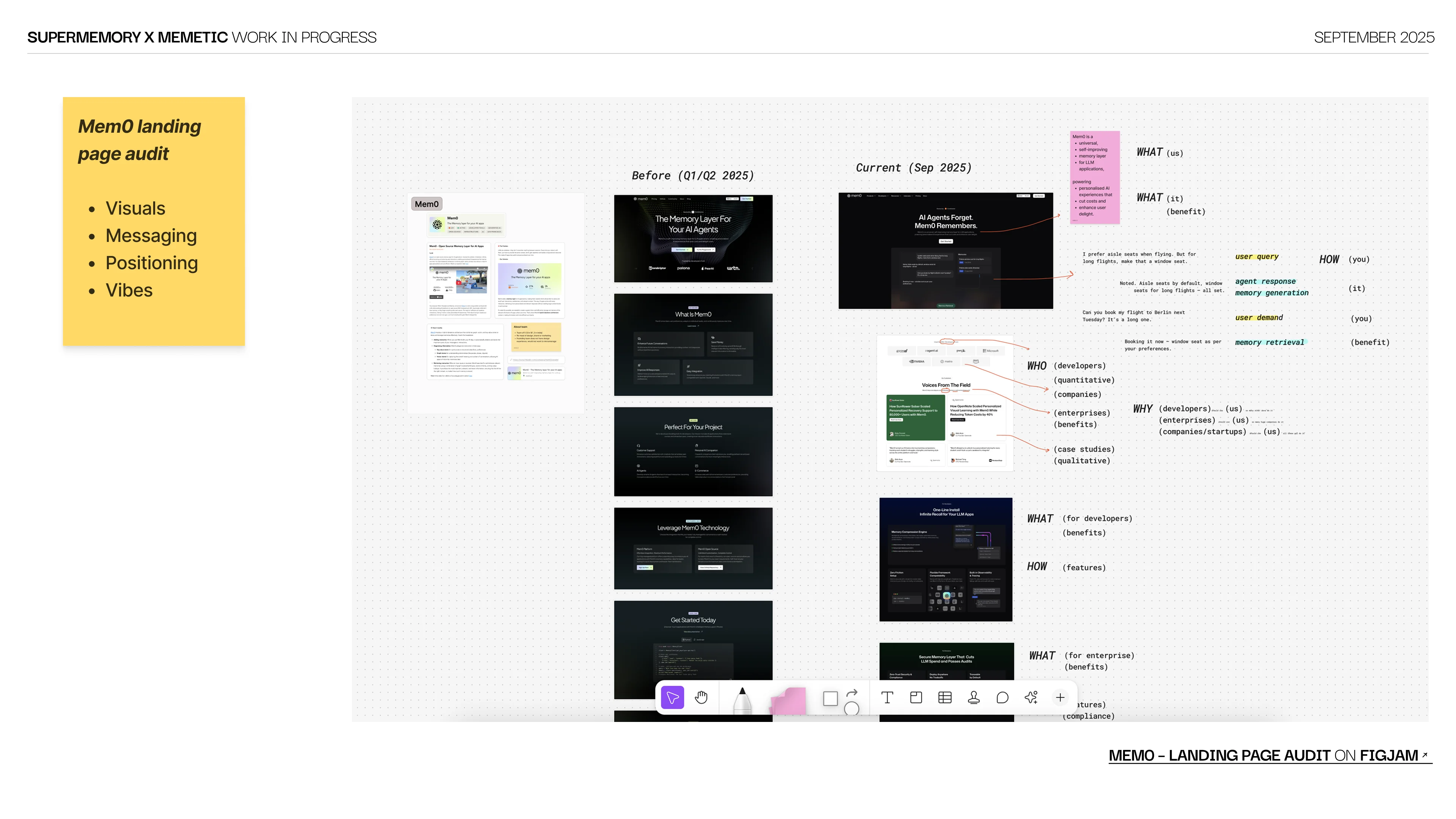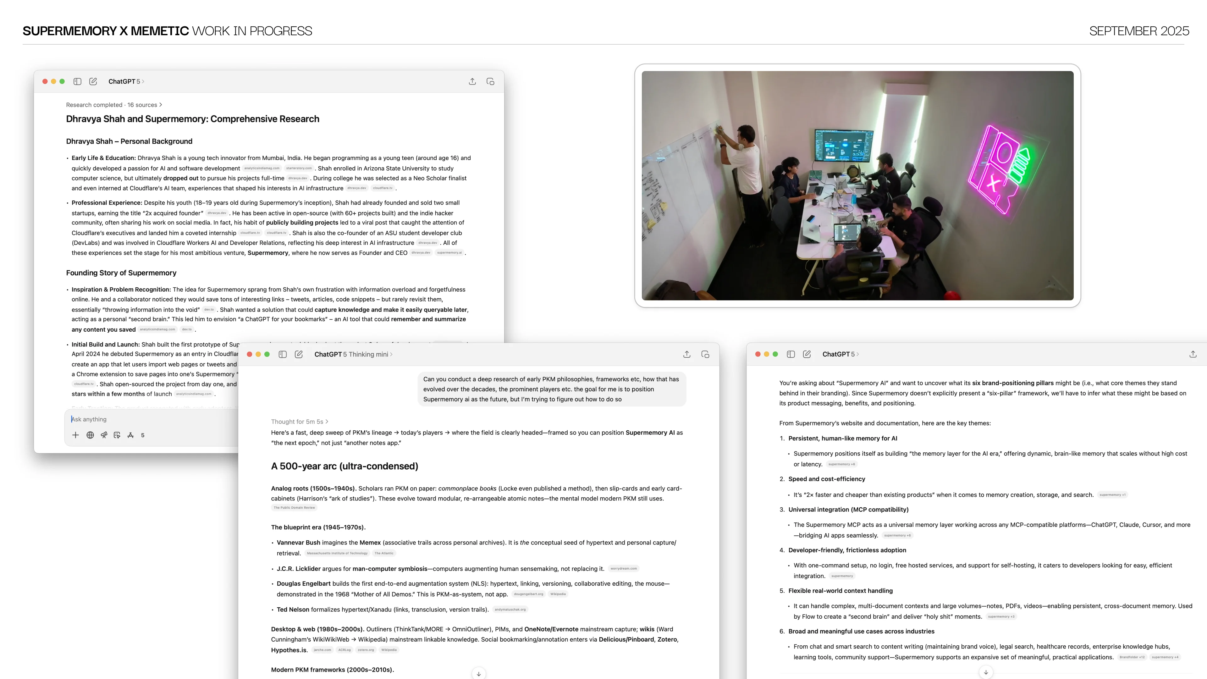 We ran a custom brand workshop with Dhravya, CEO and founder of Supermemory. Product deep-dive, competitor mapping and audience definition, all pre-researched from our side. The workshop gave us a window into the founder's thinking and the reasoning behind product decisions. We synthesized the session with AI and call transcripts into brand direction ideas that shaped every design decision moving forward.