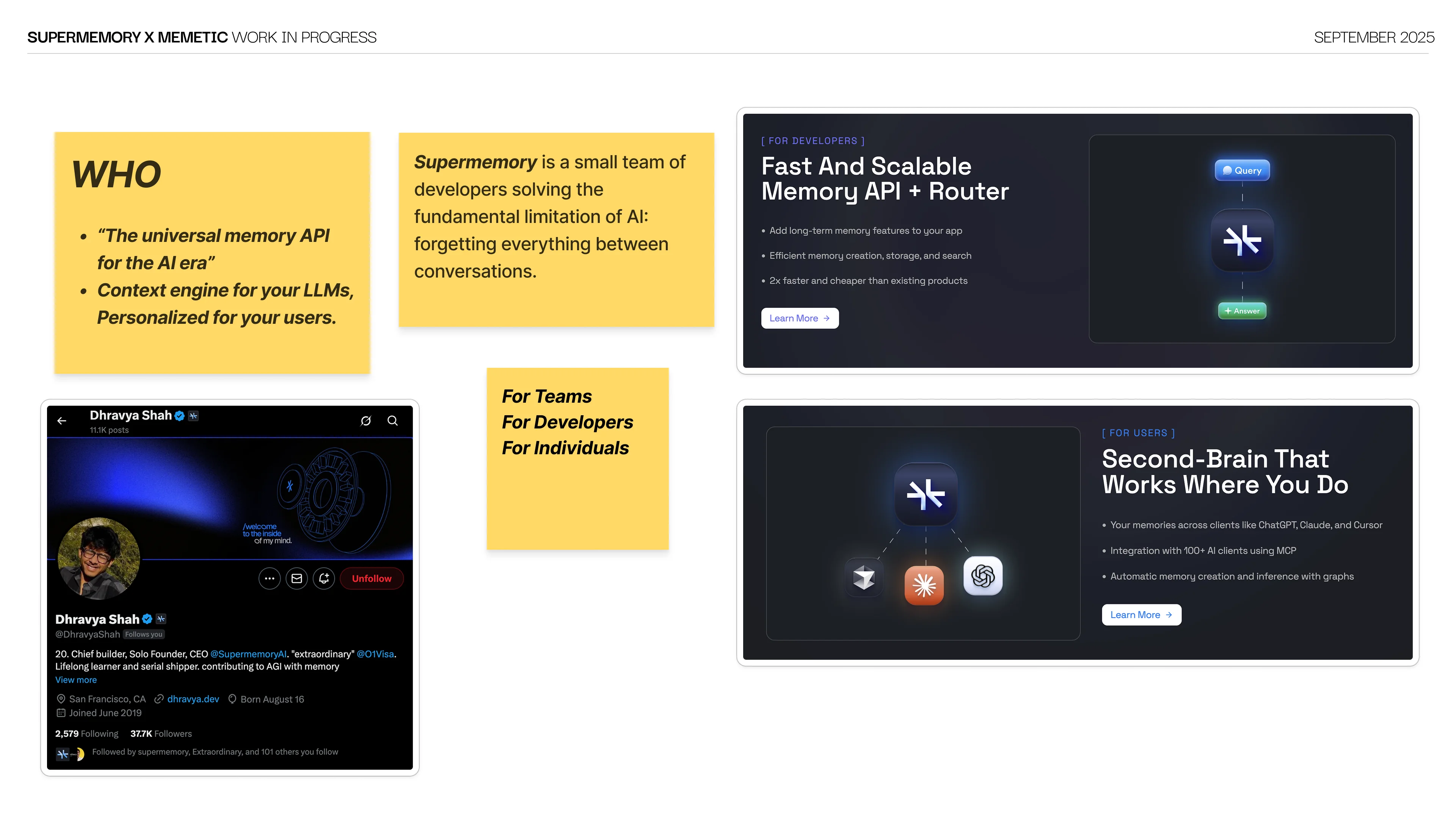 Supermemory's entire web presence was a single slide-like page with CTAs to their docs and platform. No story, no segmentation, no brand. Three audiences (enterprise developers, plugin users and consumers) hit the same generic page and had no reason to stay.