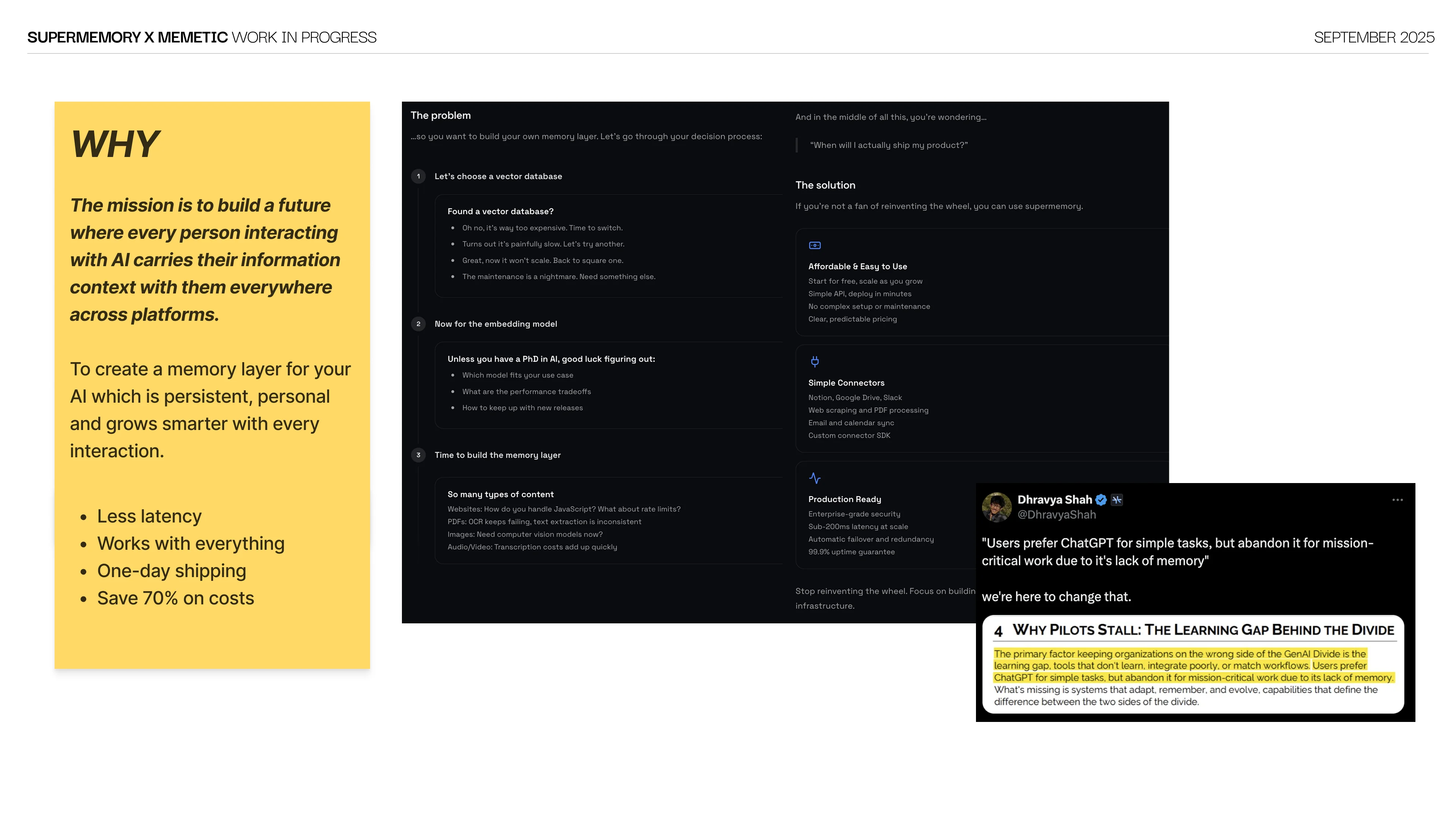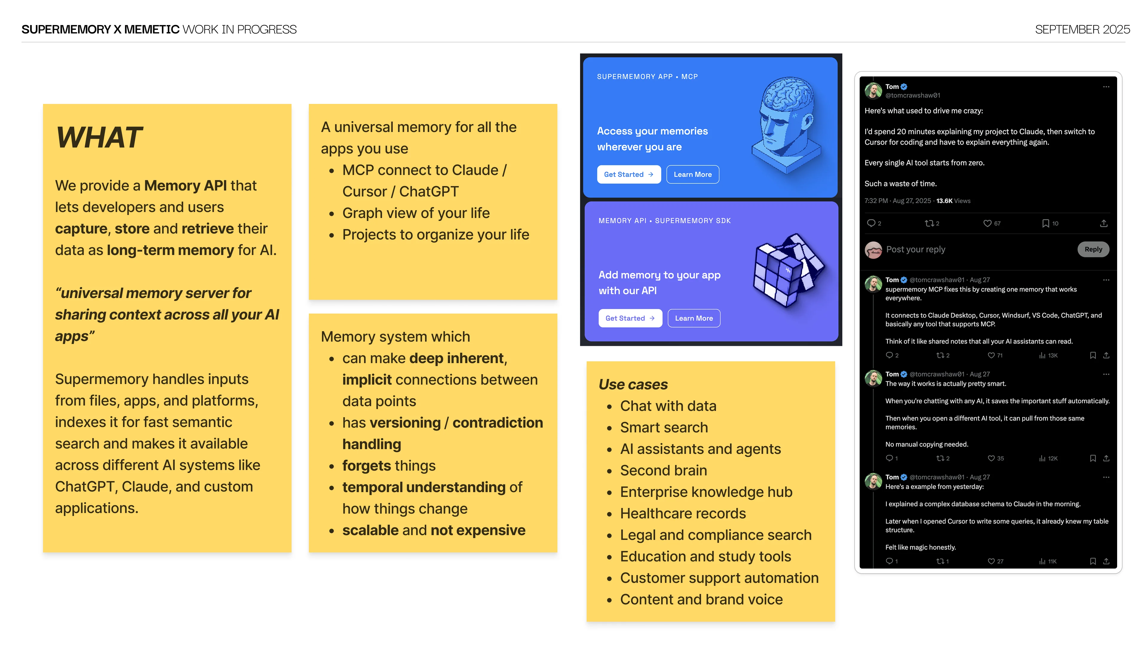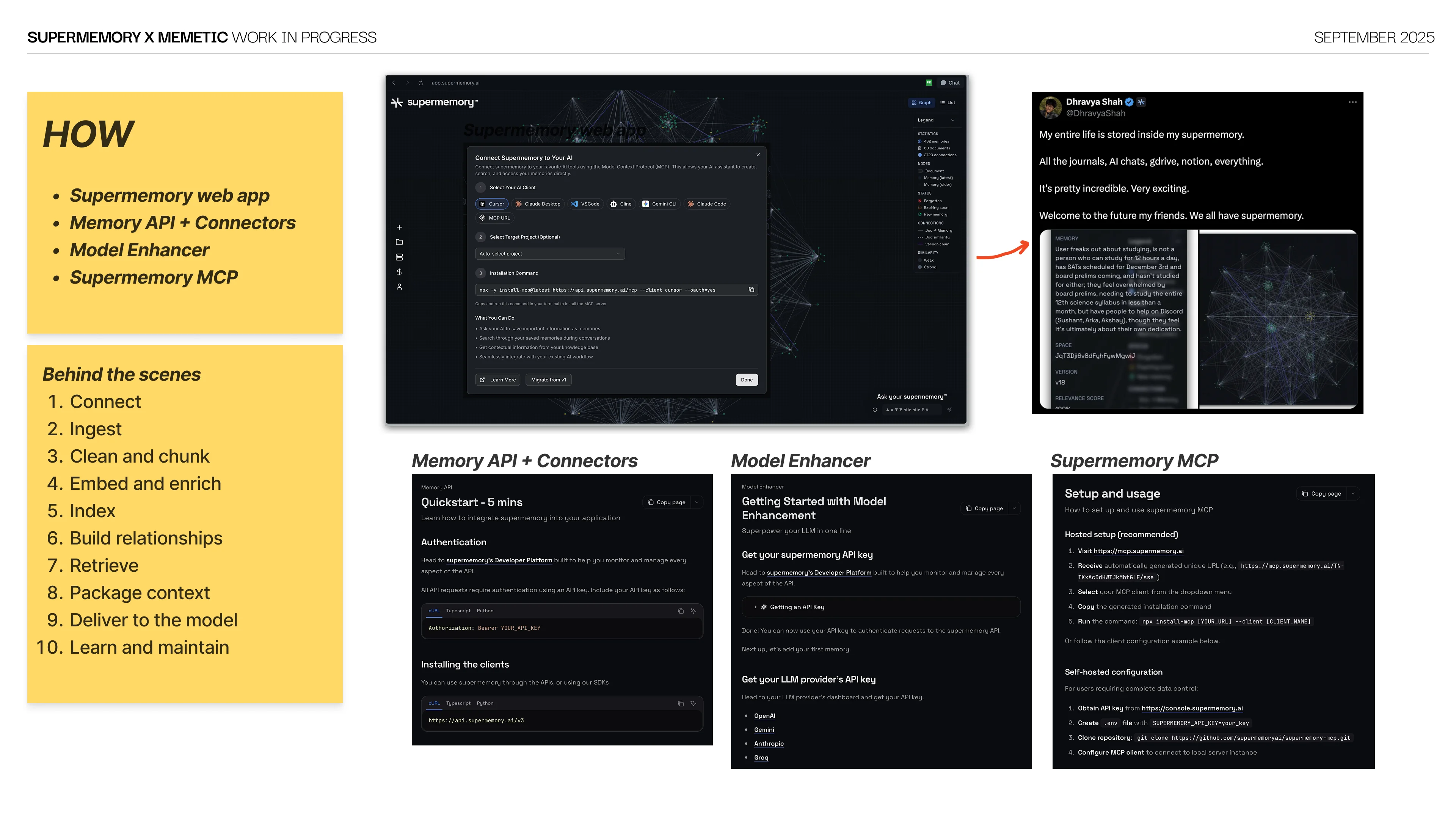 As Supermemory grew, three verticals came into play: enterprise, plugins and consumer. We revamped the website with flat grid blocky UI, built templatized pages with custom CMS in Framer and shipped the 'Unforgettable Week' launch campaign through the holidays. Videos and social media content were constant on-demand deliverables throughout.